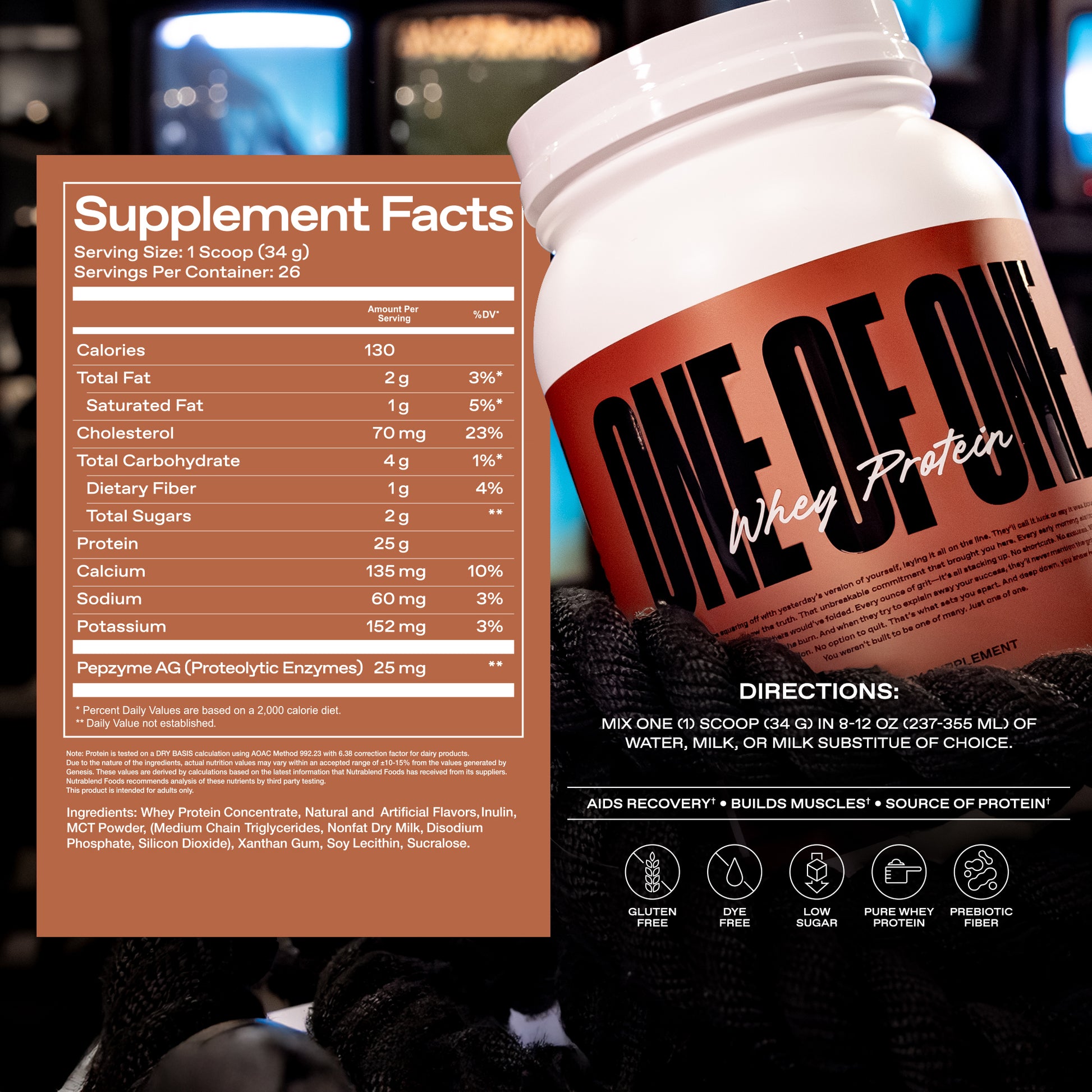While there are no nuts in ONE OF ONE Whey Protein, it is made in a facility that also processes egg, sesame, peanuts and tree nuts, fish/crustaceans/shellfish oils, and wheat products.